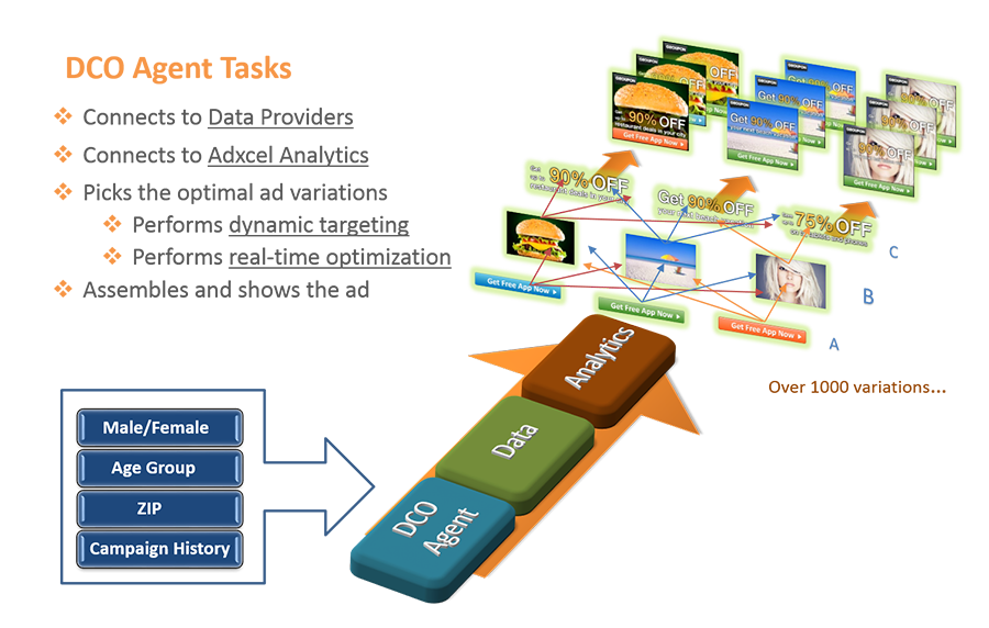 A Dynamic Creative Ad is generated for each individual ad impression based on the highest likelihood of obtaining conversion from a partcular user. The process of assembling the optimal Ad is called Dynamic Creative Optimization and is performed by the DCO agent that is a part of each DCO-enabled ad. The DCO agent uses first or third party audience data and campaign analytics to assemble the right Ad using multifactor stochastic optimization.